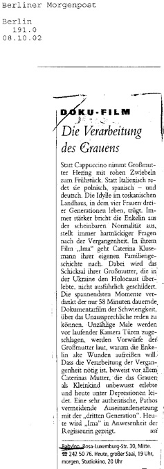 Auf Hebräisch heisst Mutter "Ima". Daran erinnert sich die Grossmutter am Ende des Films, nachdem sie die Geschichte ihrer Verfolgung erzählt hat. Sie vertraut ihrer Enkelin auch an, dass sie sich in bitterer Not immer noch der paar Worte Hebräisch entsinne, die ihr die eigene Mutter für diese Fälle beigebracht habe. Im Medium der Sprache sind die Spuren der Person konserviert, die sie einmal war. Sie widersprechen der Auffasung, dass Vergessen möglich ist.